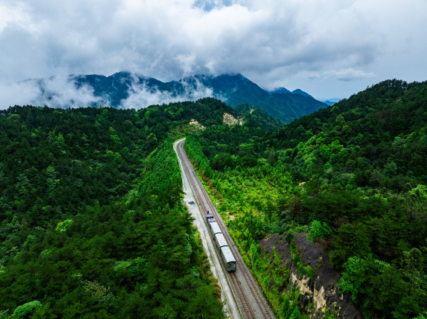 乘坐纜車登頂明月山后,艾芙琳漫步青云棧道,俯瞰月亮湖的碧波,并體驗(yàn)了高山小火車“嫦娥號(hào)”,沿途的云海、森林與村落交織,宛如畫(huà)卷。 明月山小火車穿行在山野間。陳旅 攝