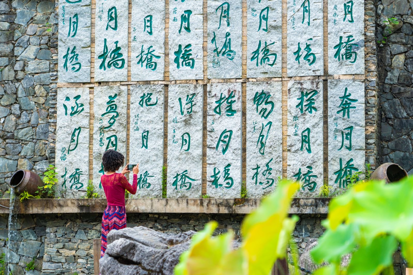 隨后,艾芙琳探訪了入選“國(guó)家森林養(yǎng)生重點(diǎn)建設(shè)基地”的二十四橋明月園。這座占地3150畝的綜合性莊園以月亮文化和橋文化為主題,融合農(nóng)業(yè)觀光、森林康養(yǎng)、民俗體驗(yàn)于一體。園內(nèi)自產(chǎn)自足的綠色食材、百畝花海、24座特色小橋,以及書(shū)法家創(chuàng)作的“明月”主題作品,令艾芙琳連連稱贊:“這里實(shí)現(xiàn)了人與自然的完美共生。” 艾芙琳正在拍攝石刻書(shū)法作品 陳旅 攝