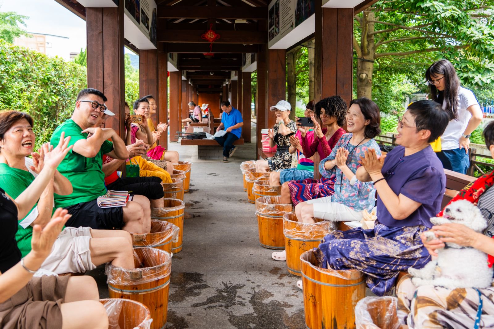 站在溫湯古井旁,艾芙琳與來(lái)自上海、廣州等地的“新溫湯人”親切交流。這群長(zhǎng)期旅居的退休老人,每日在文化長(zhǎng)廊泡腳、唱歌,享受富硒溫泉帶來(lái)的健康生活。來(lái)自上海的退休教師王美華已在溫湯鎮(zhèn)旅居3年。她說(shuō):“我患有輕度關(guān)節(jié)炎,來(lái)這里泡溫泉半年后,疼痛明顯緩解。現(xiàn)在每天和朋友們?cè)陂L(zhǎng)廊泡腳唱歌,生活愜意。” 艾芙琳與“新溫湯人”在一起唱歌。陳旅 攝