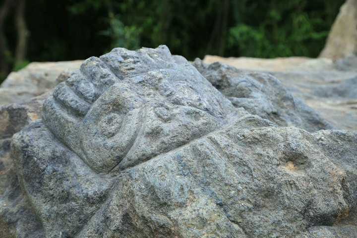 2015年,當(dāng)?shù)貙?duì)神農(nóng)部落旅游資源進(jìn)行調(diào)查時(shí),偶然發(fā)現(xiàn)了多處巖石上的凹穴。在桐柏山上竹林環(huán)繞的半山腰處,一塊巖石上赫然可見(jiàn)一處形似人面像的巖畫(huà)——“頭頂”約有10條線(xiàn)狀紋飾,組成“皇冠”的圖案;面部的圓環(huán)和圓點(diǎn),表示“雙眼”;下部5條射線(xiàn)狀紋飾,恰似“胡須”。這一長(zhǎng)20厘米、寬27厘米的人面像,是隨州發(fā)現(xiàn)的石器時(shí)期最為具象的巖畫(huà),被當(dāng)?shù)厝朔Q(chēng)為“太陽(yáng)神”,也有人稱(chēng)他為“炎帝神農(nóng)像”。