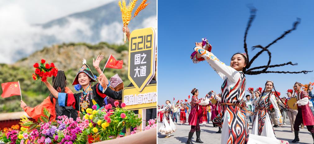 左圖:2025年8月21日上午,彩車(chē)上的演員通過(guò)西藏拉薩市布達(dá)拉宮廣場(chǎng)時(shí)向人群揮手,熱烈慶祝西藏自治區(qū)成立60周年。右圖:2025年9月23日下午,群眾載歌載舞,喜迎新疆維吾爾自治區(qū)成立70周年。新華社記者 丁增尼達(dá) 畢曉洋 攝