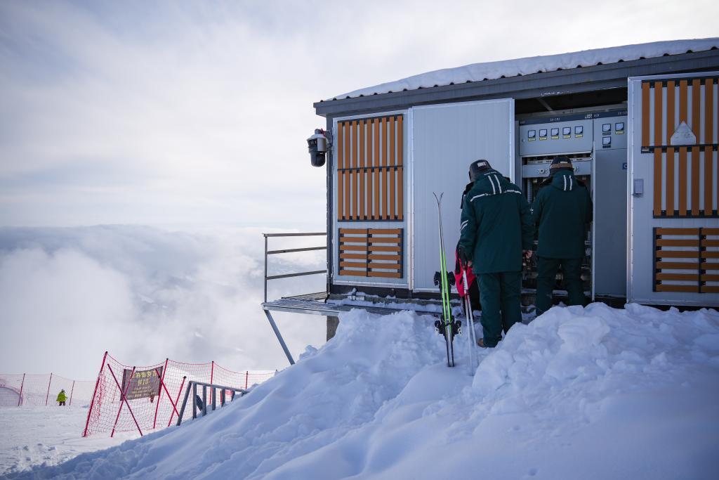 齊凡和哈依沙爾帶著雪具乘纜車抵達(dá)海拔2800米的云霄峰頂,這里是高級雪道的起點,也是電力保障的重中之重。