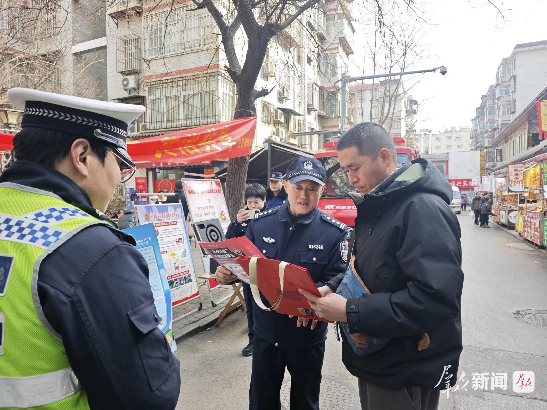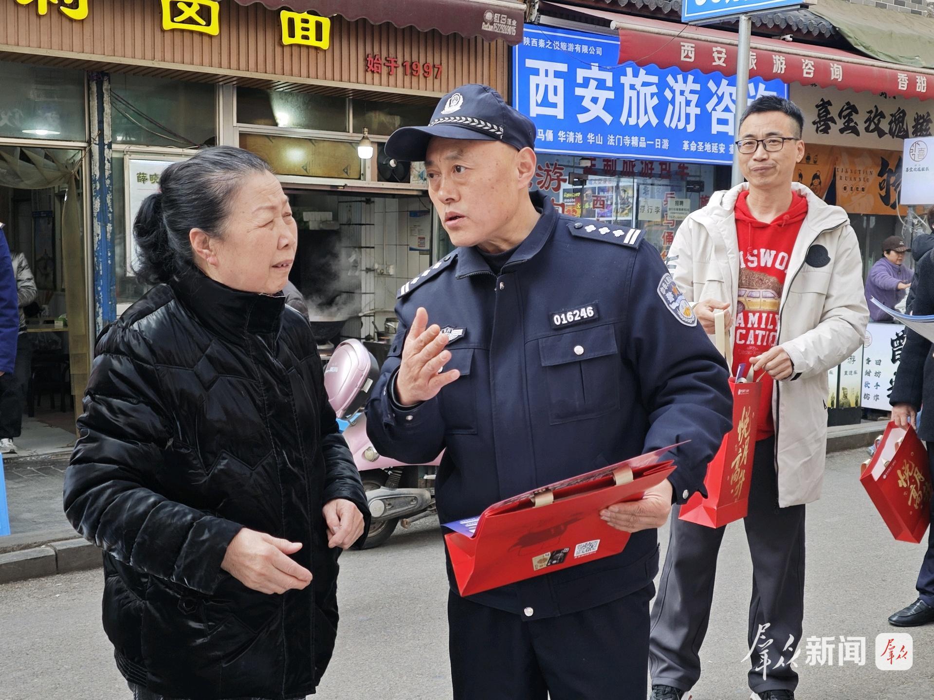 2月7日,在西安市碑林區(qū)南院門(mén)街道鐘樓社區(qū)鐘樓小區(qū)的院子里,姚六一和碑林區(qū)消防部門(mén)和交管部門(mén)的同志們一起,給小區(qū)里的居民送春聯(lián),給商戶(hù)送上“九小場(chǎng)所”消防安全提示宣傳冊(cè)。