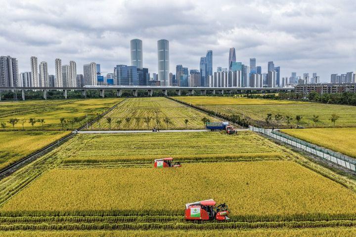 2025年10月21日,收割機在浙江省杭州市蕭山區(qū)世紀田園糧食功能區(qū)的稻田里收割水稻,遠處高鐵列車飛馳而過(無人機照片)。新華社記者 徐昱 攝