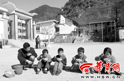 朱金魁將午飯送到學(xué)校,孩子們吃得很香。4個孩子的戶口讓他茶飯不思