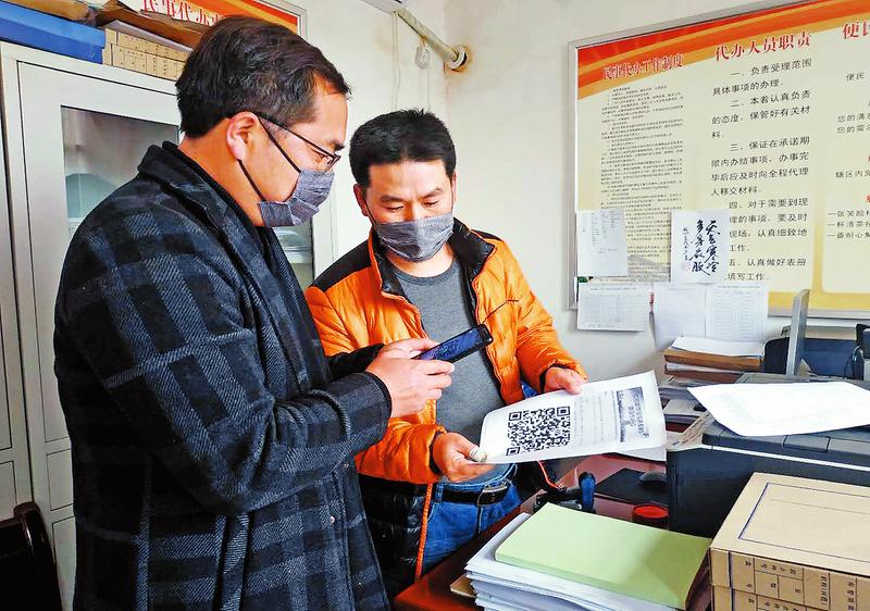 腰市村勞務(wù)信息員牛曉亮(右)正在幫村民掃描二維碼進(jìn)行信息登記