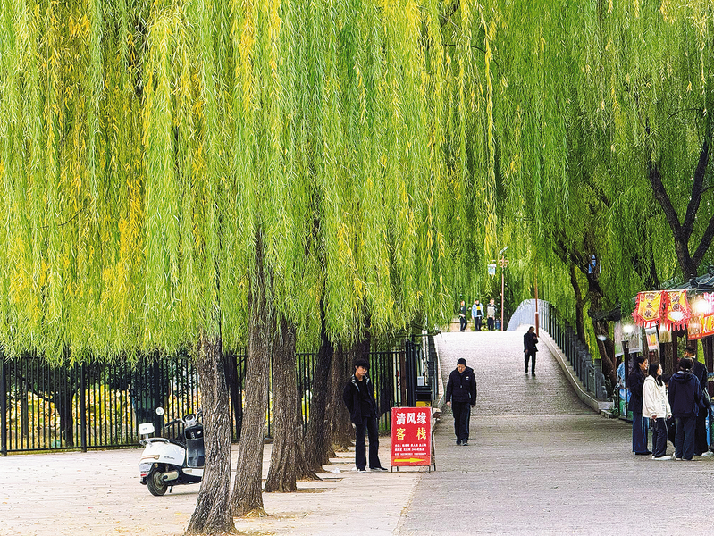 在丹鳳縣棣花古鎮(zhèn),柳枝翠綠中夾雜著金黃,如美女柔順的發(fā)絲千萬條垂下,別具一種秋日的美。