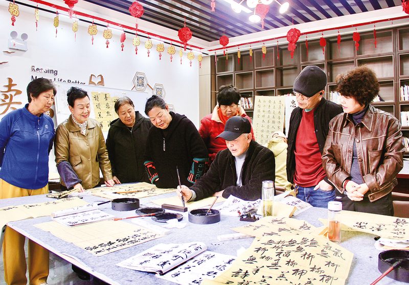 教室的另一邊,幾位學(xué)員正圍著荊長(zhǎng)繩請(qǐng)教問(wèn)題。“楷書講究的是‘筋肉豐滿’,起筆的時(shí)候要慢一點(diǎn),把筆鋒藏好。”荊長(zhǎng)繩坐在學(xué)生中間,仔細(xì)講解。不知不覺(jué)間,一節(jié)課的時(shí)間過(guò)去了。下課后,老人們并沒(méi)有立刻離開(kāi),而是圍在一起,互相交流著自己的作品,分享著學(xué)習(xí)的感悟,教室里充滿了歡聲笑語(yǔ)。
