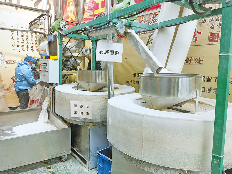 隨著石磨轉(zhuǎn)動,石磨面粉生產(chǎn)車間里麥香四溢。