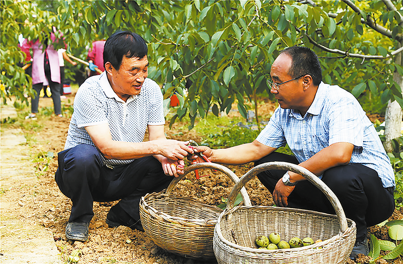 王根憲(左一)在洛南縣紅仁核桃種植園了解核桃仁品質情況。 (資料圖片)