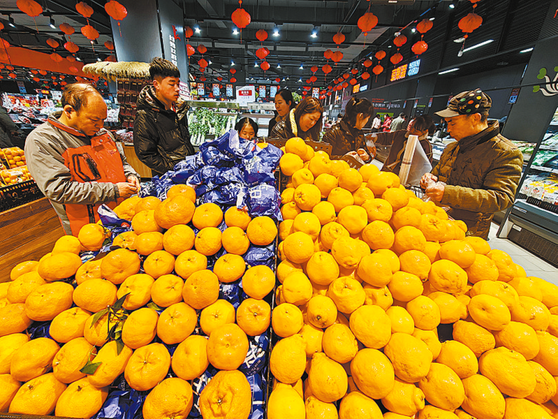 △各大商超備足了種類豐富的年貨,琳瑯滿目的水果、干果等年貨擺滿貨架。