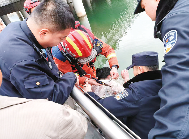 2月16日(除夕)16時53分,商州區(qū)丹南派出所接警稱兩河口公園附近橋下有人落水。值班民警、輔警迅速出警并聯(lián)系119、120,聯(lián)合消防救援隊將落水夫妻王某、趙某營救上岸,二人無生命危險,后由120送醫(yī)。(本報通訊員 王宇欣 攝)