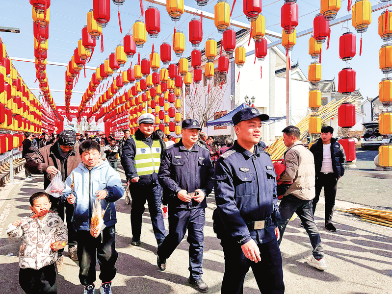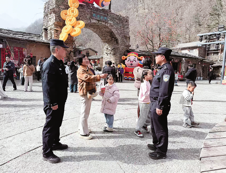 2月17日(大年初一),洛南縣四皓派出所安排精干警力在轄區(qū)重點景區(qū)音樂小鎮(zhèn)開展執(zhí)勤巡邏工作,全力確保景區(qū)良好秩序。圖為執(zhí)勤民警在游人如織的音樂小鎮(zhèn)中巡邏值守。 (本報通訊員 白 媛 攝)