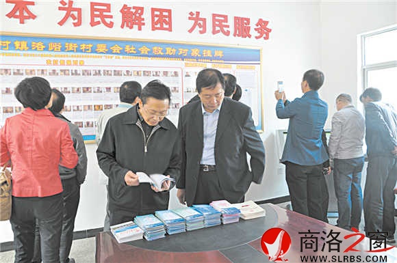 在山陽縣中村鎮(zhèn)洛峪街村,市民政局局長賈意有和山陽縣民政局局長江忠庭在翻閱宣傳手冊(cè)。
