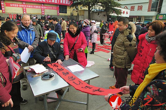 1月16日,“金雞報春商州百名書畫家義寫春聯(lián)進萬家”活動在市中心廣場舉行,130多名書畫家現(xiàn)場為群眾書寫春聯(lián)5000多副。(記者楊鑫 胡蝶攝)