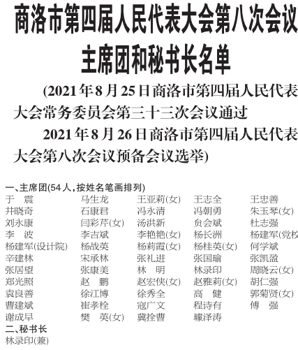 本報訊(記者 余婷)8月26日下午,商洛市第四屆人民代表大會第八次會議主席團舉行第二次會議。大會主席團常務主席張凱盈主持會議,主席團其他成員出席會議?! h應到54人,出席53人,出席人數符合法定人數。 ...