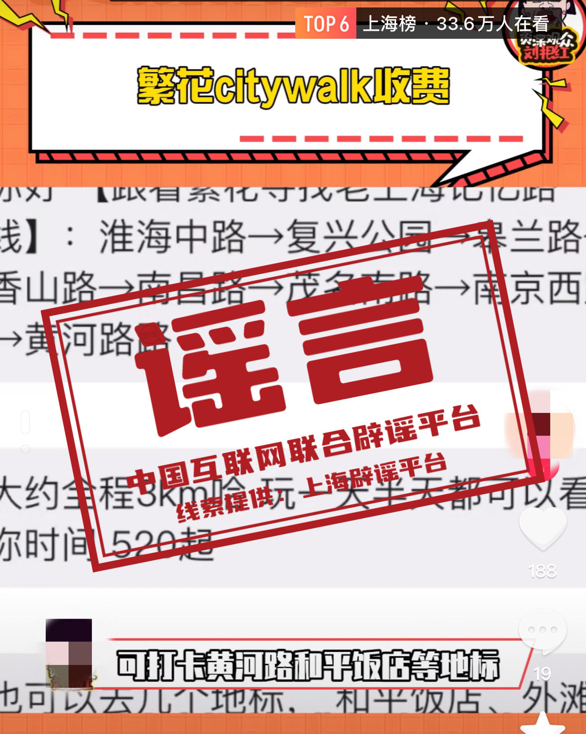 為此,上海辟謠平臺(tái)以“上海Citywalk”“繁花Citywalk”等為關(guān)鍵詞,搜索了多家旅游服務(wù)在線平臺(tái)、社交平臺(tái),都沒(méi)有發(fā)現(xiàn)主播們引用的“3公里Citywalk收費(fèi)520元”圖片,也沒(méi)有看到與“繁花Citywalk”相關(guān)的收費(fèi)服務(wù)。(來(lái)源:“上海網(wǎng)絡(luò)辟謠”微信公眾號(hào))