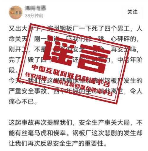 謠言:山東濱州鋼板廠發(fā)生安全事故死了四個(gè)工人?
