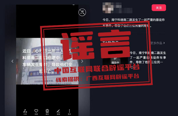 真相:近期,有網(wǎng)民在短視頻平臺(tái)上發(fā)布視頻稱“某派出所三人在路口巡邏中,突然車(chē)輛發(fā)生爆炸,導(dǎo)致三位民警全部犧牲”。經(jīng)南寧公安部門(mén)調(diào)查,該信息為謠言。網(wǎng)民韋某為吸引關(guān)注,杜撰此條謠言信息,并利用手機(jī)進(jìn)行發(fā)布。根據(jù)《中華人民共和國(guó)治安管理處罰法》第二十五條,屬地公安機(jī)關(guān)已依法對(duì)韋某處以行政處罰。(來(lái)源:廣西互聯(lián)網(wǎng)辟謠平臺(tái)、南寧網(wǎng)警)