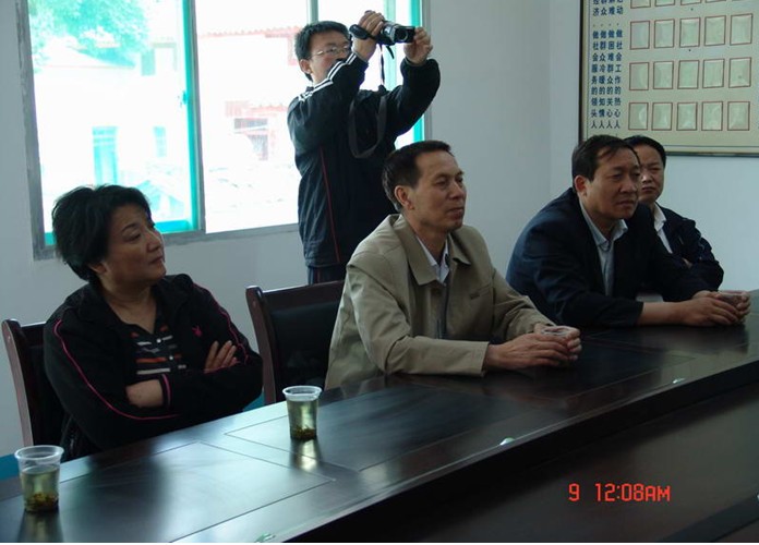 市環(huán)保局黨組書記、局長翁同德(左二)、黨組成員、副局長袁 娜(左一)、黨組成員、紀(jì)檢組長閆緒民聽取東川鎮(zhèn)黨委和鄭家莊村委會匯報全村經(jīng)濟(jì)社會發(fā)展情況。