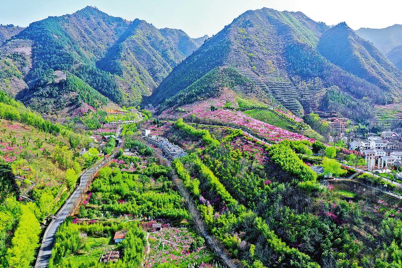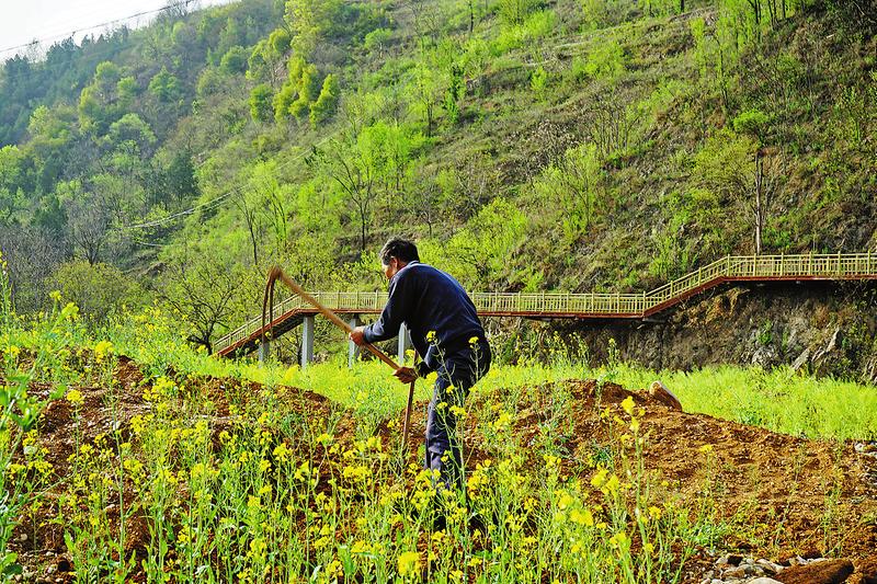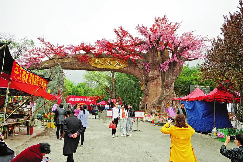 春日里的桃花谷風光秀麗,空氣清新,吸引了大批游客前來踏青。游客的增多為周邊農(nóng)家樂帶來了客源,各類小吃為旅程增味添香。走進北邊的州河北采摘園,游人如織,賞芍藥,望遠方。大風車點綴在繁花間,成了游人拍照的搶手背景。竹林關(guān)鎮(zhèn)老街的汩汩流水,折返幾遍也不覺得厭倦。街上的米線、牛筋面、餃子等特色美食,深受游客青睞。在移民搬遷安置點的丹水社區(qū),村民們安居樂業(yè),滿懷信心邁向更加幸福的生活。