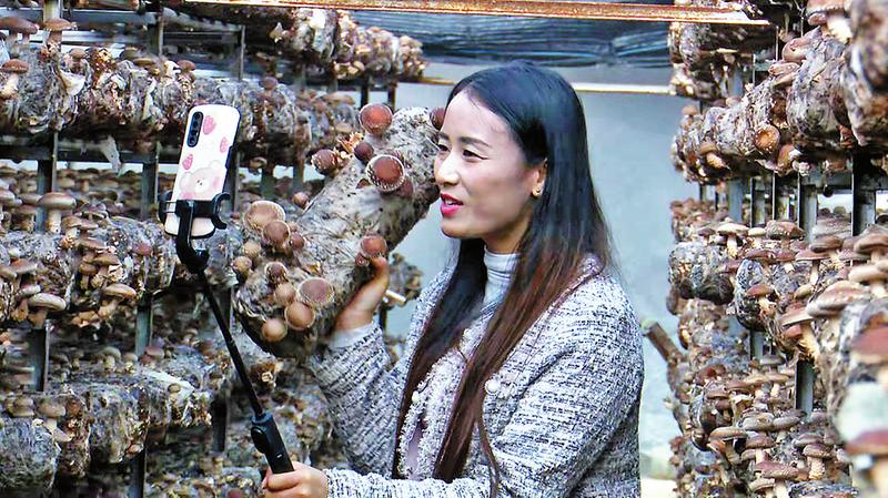 大棚里,工人們忙著采收成熟的香菇。地上到處擺放著一筐筐剛剛采摘來的新鮮香菇,4位網(wǎng)紅穿梭在一排排香菇架間,向粉絲展示香菇的生長環(huán)境,講解工人們采菇、選菇的過程。“丹鳳萌萌”手捧一個長滿“小傘”的香菇棒,不時轉(zhuǎn)動著手機(jī)向粉絲介紹香菇的生長狀態(tài)以及花菇同平菇的區(qū)別。直播間里互動頻繁,異常活躍。