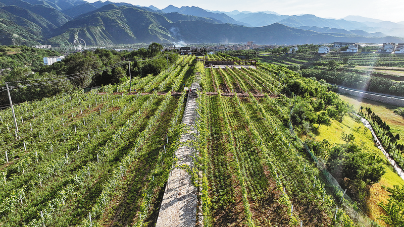 項(xiàng)目進(jìn)展:已完成投資6000萬元,建成高標(biāo)準(zhǔn)葡萄基地2000畝、水雜果園600畝,栽種連翹6萬多株,建設(shè)園區(qū)道路6.5公里,鋪設(shè)灌溉管網(wǎng)10公里。