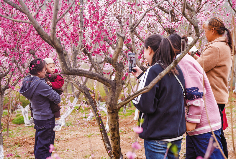 谷內(nèi)漫山遍野的桃花次第綻放,粉白嬌嫩的花朵燦若云霞,吸引了眾多游客前來賞花踏春,感受春日浪漫。游人徜徉其中,或駐足欣賞,或拍照留念,或現(xiàn)場(chǎng)直播,或拍攝短視頻,歡聲笑語此起彼伏,盡享春日的美好。