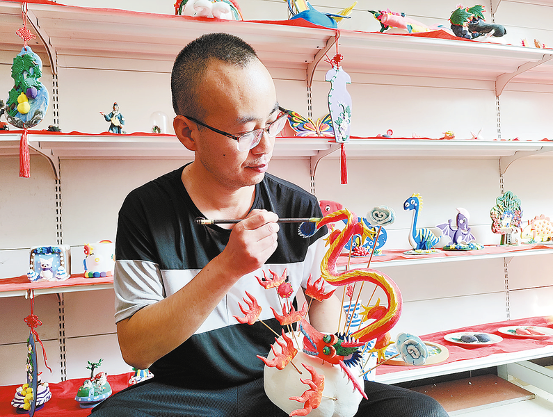 張廣新坐在工作臺前,用手捏制一只大臉貓。不一會兒,一個造型夸張、憨態(tài)可掬的大臉貓便呈現出來,看上去賞心悅目。