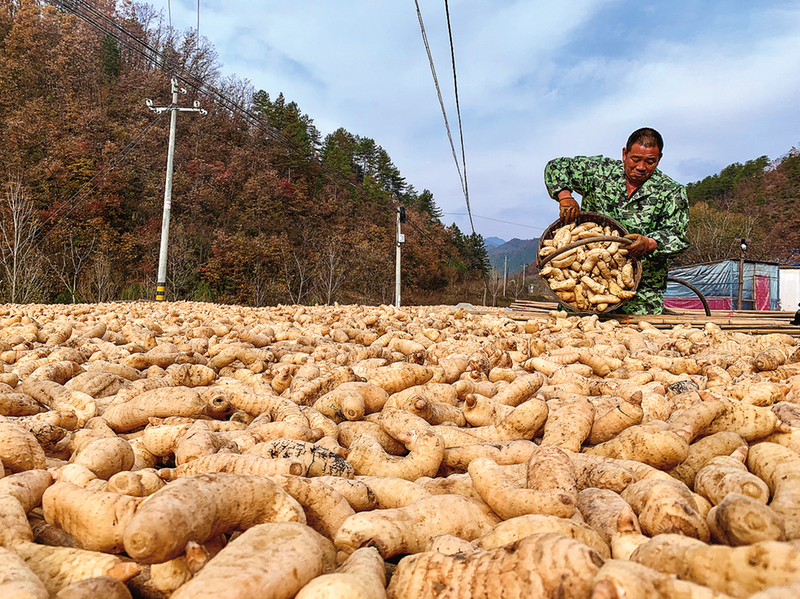 近期,丹鳳縣巒莊鎮(zhèn)天麻進(jìn)入收獲期,群眾在晾曬天麻。