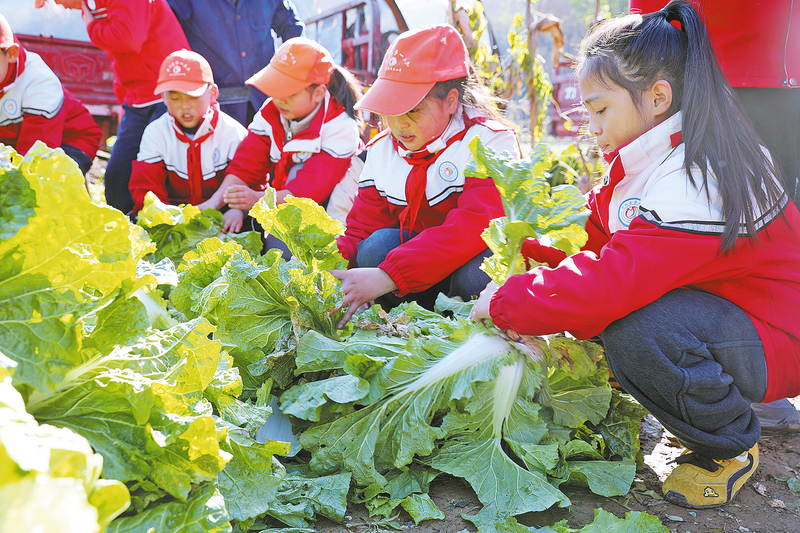 田間地頭,老師帶領(lǐng)同學(xué)們分工協(xié)作、互幫互助,大家齊心協(xié)力采收白菜。