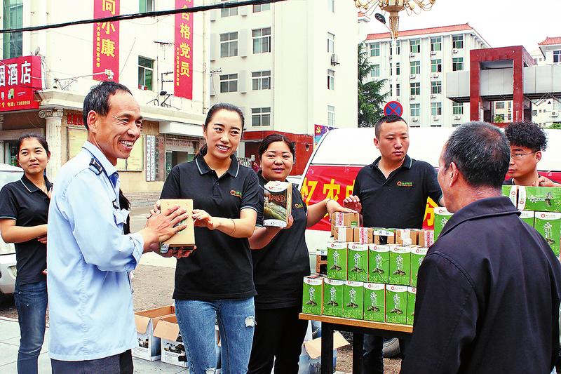 2021年6月12日,王洋向環(huán)衛(wèi)工人送去粽子和蜂蜜。領(lǐng)辦眾鑫農(nóng)園合作社以來,每逢春節(jié)、端午、國慶等節(jié)日,王洋都會看