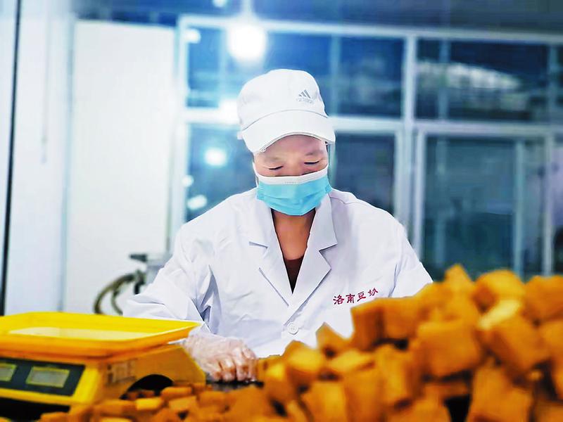 陽春三月,王洋接手父親的生意。為從源頭上提升產(chǎn)品品質(zhì),當(dāng)年5月,王洋在洛南縣城關(guān)街辦棲鳳灣社區(qū)征地,創(chuàng)辦洛南縣民生食品科技開發(fā)有限責(zé)任公司,把呼倫山的山泉直接引入生產(chǎn)車間,專門從事傳統(tǒng)豆腐、豆腐干、豆腐皮生產(chǎn),在城區(qū)和西安等地設(shè)立“百年王家豆腐”鮮品店。2年后,公司成為商洛市首批農(nóng)業(yè)龍頭企業(yè)之一。目前,公司擁有技術(shù)工人32名,開辟就業(yè)扶貧崗位55個,年加工大豆5000噸,生產(chǎn)鮮豆腐、豆腐干、豆腐皮等12類系列豆制品。