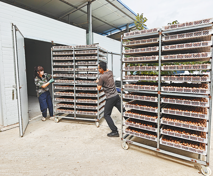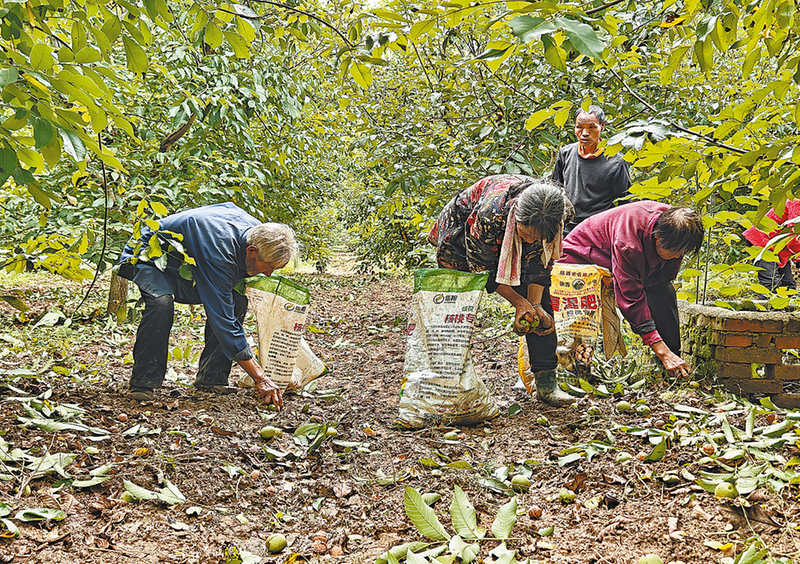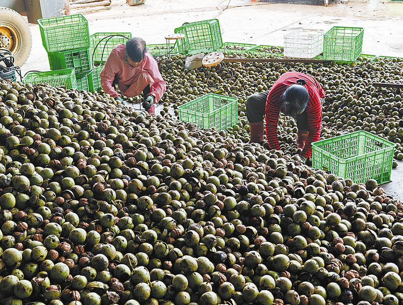 △剛剛從樹上打下來的鮮核桃,村民及時撿拾,收集后運送至廠區(qū)。