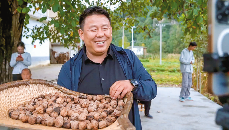薛超正在對著手機直播,將村民的核桃、木耳等農產品通過網絡平臺銷售出去。