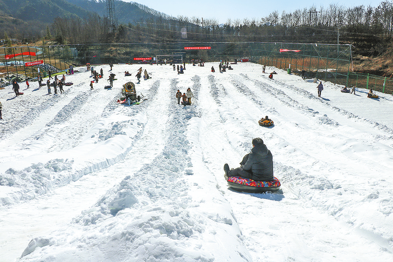 2月8日,游客在洛南縣音樂小鎮(zhèn)秋沙鴨親子樂園內(nèi)的滑雪場滑雪。