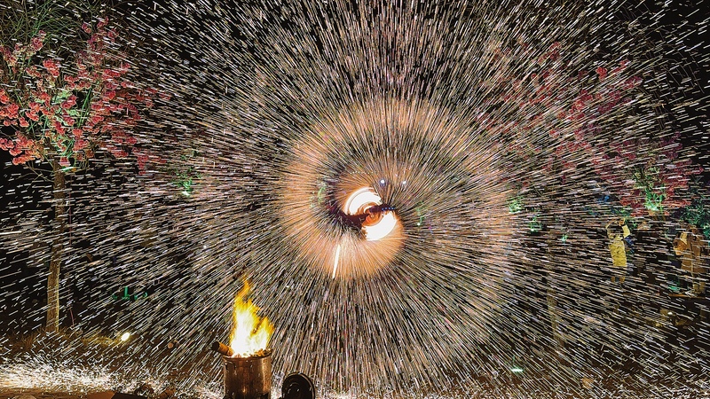 穿插在打鐵花間隙的“風(fēng)火輪”表演火光旋舞,光帶成環(huán),現(xiàn)場(chǎng)更添熱烈。