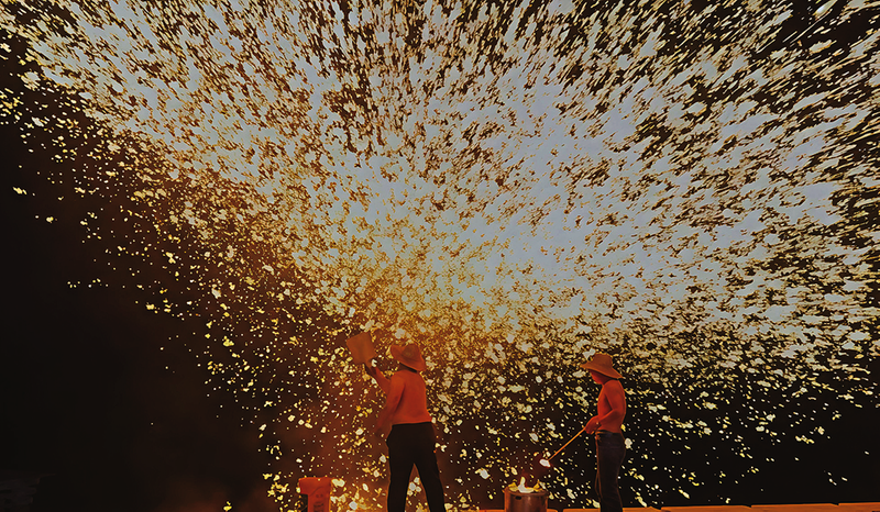 鐵花如金雨迸散,瞬間點(diǎn)亮夜空。