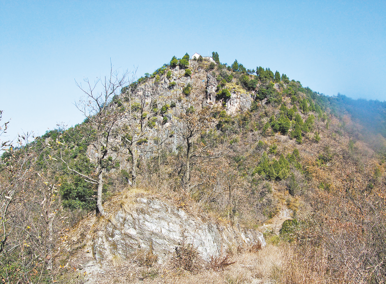 到了廟前,卻是另一番景象,廟的地基建在巖石上,白石為基,青磚砌墻,表面涂以白灰。墻外聳立著一塊塊半人高的巖石,如柱,如筍,如鼓,如鐘,扎根在巖石里,散開(kāi)在山坡上,像是參加一場(chǎng)聚會(huì)。在這些凸出的巖石間,長(zhǎng)著幾棵碗口粗形態(tài)怪異的冬青樹(shù),每棵三五根樹(shù)干,白樹(shù)皮,綠樹(shù)冠。其余的多為鐵匠木,再往前便是斷崖。