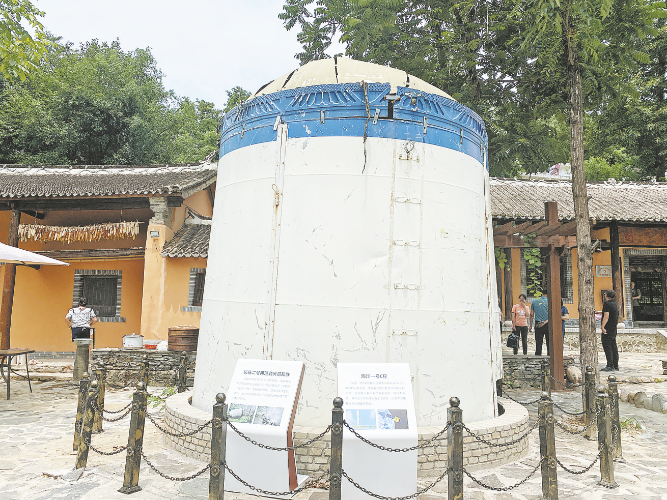 長征二號丙運載火箭殘骸墜落在二郎廟村深山中,村上將其運回安放在村史館旁,現(xiàn)已成為游客拍照的網(wǎng)紅打卡點。