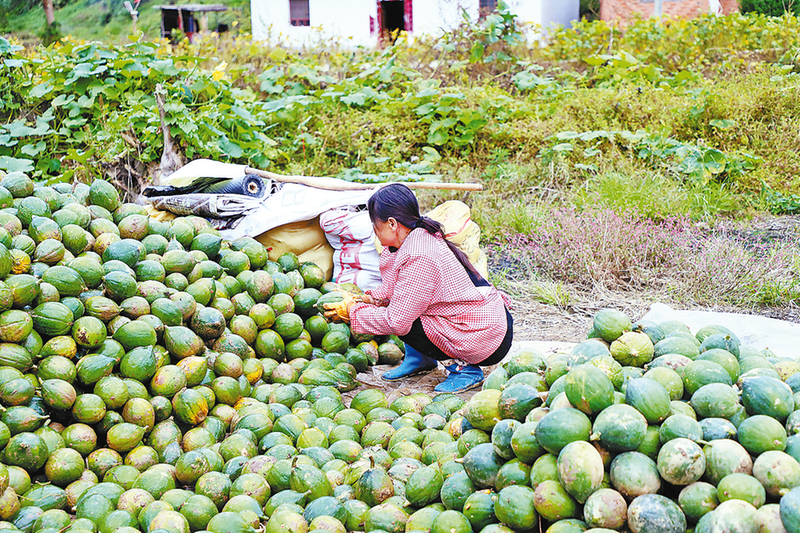店坊河村村民劉湘琴用雙手輕輕一掰,就將藤蔓上瓜蔞分開一條裂縫,麻利地將瓜籽挖出,再將瓜蔞皮一分為二背靠背晾曬在藤上。“成熟的瓜蔞先不著急摘下來,掏出瓜籽后,自然風干的瓜皮可以入藥。”劉湘琴說,“我60多歲了,平時在家干完家務,就到離家不遠的種植基地干點農(nóng)活,每天有80元的收入。一年四季在家門口干些零星活兒,也能掙幾千元哩!”