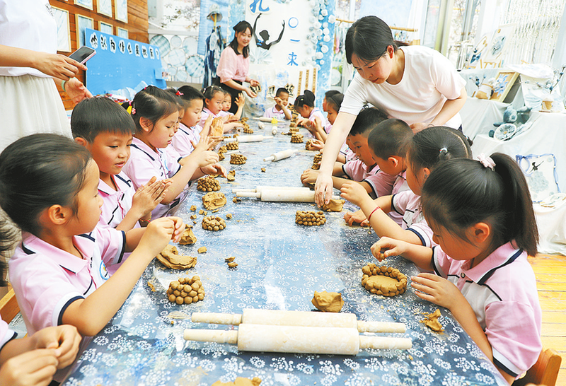 ?“非遺進校園”活動中,文化志愿者為雅都幼兒園小朋友現(xiàn)場教授商南泥塑制作技藝。(商南縣文化館供圖)