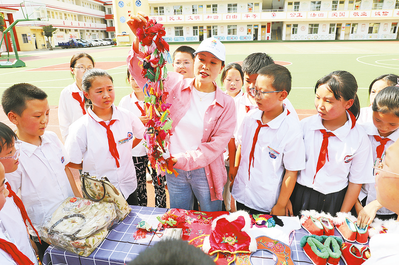 △“非遺進校園”走進試馬鎮(zhèn)中心小學(xué),商南縣文化館工作人員為學(xué)生介紹商南非遺手工香包。(商南縣文化館供圖)