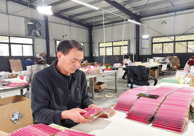 ?青山鎮(zhèn)社區(qū)工廠帶動100多人穩(wěn)定就業(yè)。圖為工人李陸林整理賀卡。