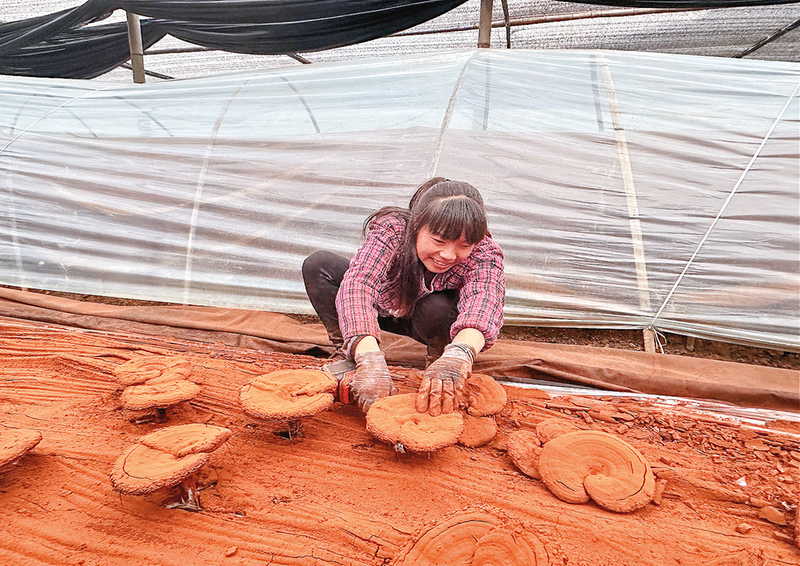 △食用菌產(chǎn)業(yè)園為周邊群眾提供務(wù)工崗位,讓群眾實現(xiàn)穩(wěn)定增收。圖為工人何芬正在剪靈芝。