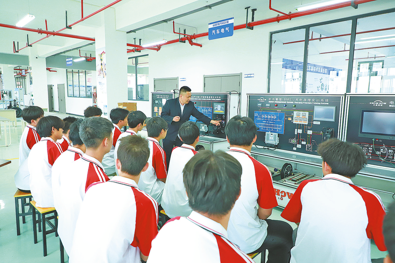 △馬飛在山陽職教汽車實訓(xùn)室內(nèi)為學(xué)生們講解智能充電實訓(xùn)系統(tǒng)相關(guān)內(nèi)容。
