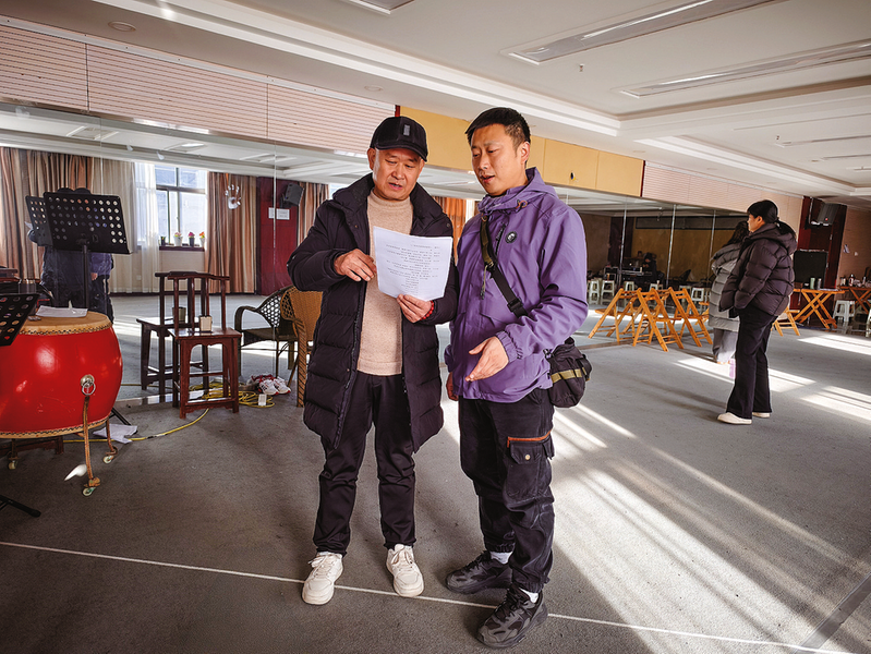 在山陽縣劇團(tuán)的排練廳里,毛杰(左)正在教年輕演員演唱山陽情歌。