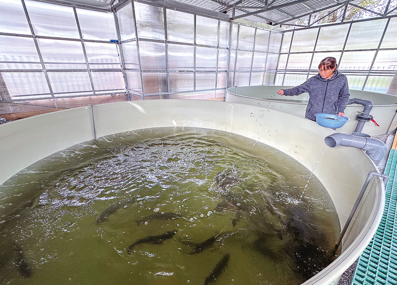 走出民宿區(qū),順著村路往前走,很快就能看到七星村的特色產(chǎn)業(yè)——七星村家庭版冷水魚養(yǎng)殖示范項(xiàng)目。封閉式的大棚內(nèi),安置著4個(gè)直徑5米的圓形養(yǎng)魚池,分別養(yǎng)著虹鱒和鱘魚兩種冷水魚。60歲的技術(shù)人員劉巧利正在給魚喂食:“我每天來給魚喂食、消毒等。基本上這里的魚都是供給村里的農(nóng)家樂了。”