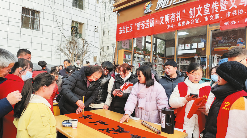 1月31日,商州區(qū)城關(guān)街道東街社區(qū)“新春送福,文明有禮”創(chuàng)文宣傳暨義寫春聯(lián)活動(dòng)在區(qū)圖書館舉行,市區(qū)十幾名書法家現(xiàn)場揮毫潑墨,為群眾義務(wù)書寫春聯(lián)460多副,為馬年春節(jié)營造濃濃的新春文化氛圍。 (本報(bào)記者 賈書章 攝)