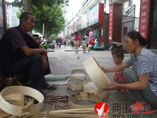 在丹鳳縣醫(yī)院門口,一位繒籮師傅在這里擺著攤,一大群人正圍著看繒籮師傅怎樣繒籮,一些人正在那里挑籮買。這位繒籮師傅是商鎮(zhèn)沙溝河人,姓張,他說一輩子了都干這活,如今年齡大了,打工沒人要,干別的啥活干不了。今年開春以來,張師傅把附近的村子都跑遍了,于是就把這活計(jì)又拿到縣城里來看有人要不,結(jié)果僅一早上就已賣出兩三個(gè)了。張師傅正說著話,又有人過來要買籮了。